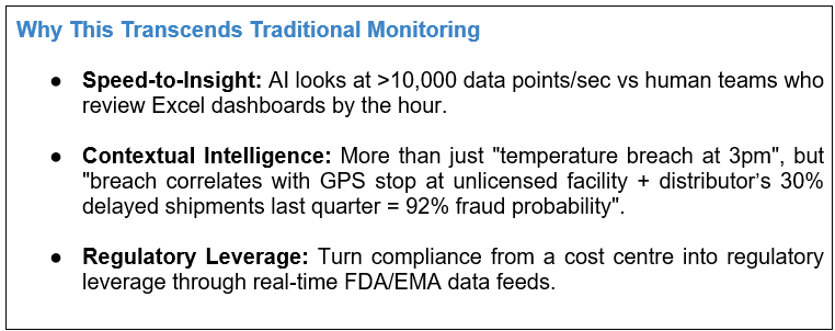 AI does not just spot defects; it understands the pattern of creating counterfeits by being trained on thousands of genuine and counterfeit examples. This makes hyper-visual inspection not only faster but fundamentally more precise (lower error rate) and scalable to millions of units, in real time.