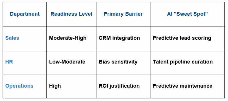 The tipping point is when companies stop asking “Are we AI-ready?” and begin asking “Where are we AI-ready?” By laying out the readiness spectrum across role-specific value lenses — marketing requires speed, legal requires precision, engineering requires iterative leverage — leaders can reduce wasted resources in resistant areas while accelerating progress in high-ROI domains. This is not mere optimization, but the art of aligning technological capability with human operational truth.