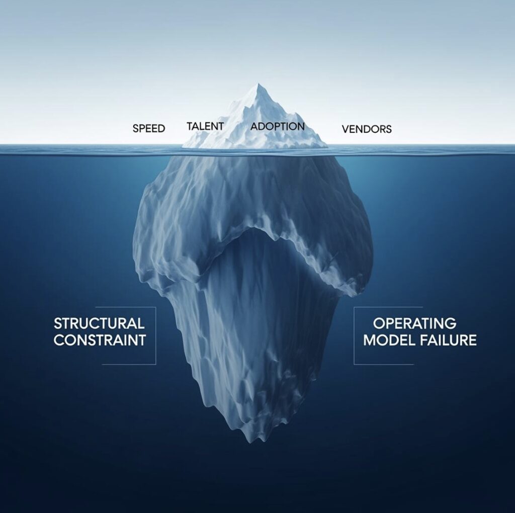 These hypotheses feel credible because they are usually directionally correct. Low adoption is real. Execution may indeed be too slow. Talent may be stretched. Vendor performance may be uneven. But in many cases these are downstream effects of a more fundamental structural constraint.