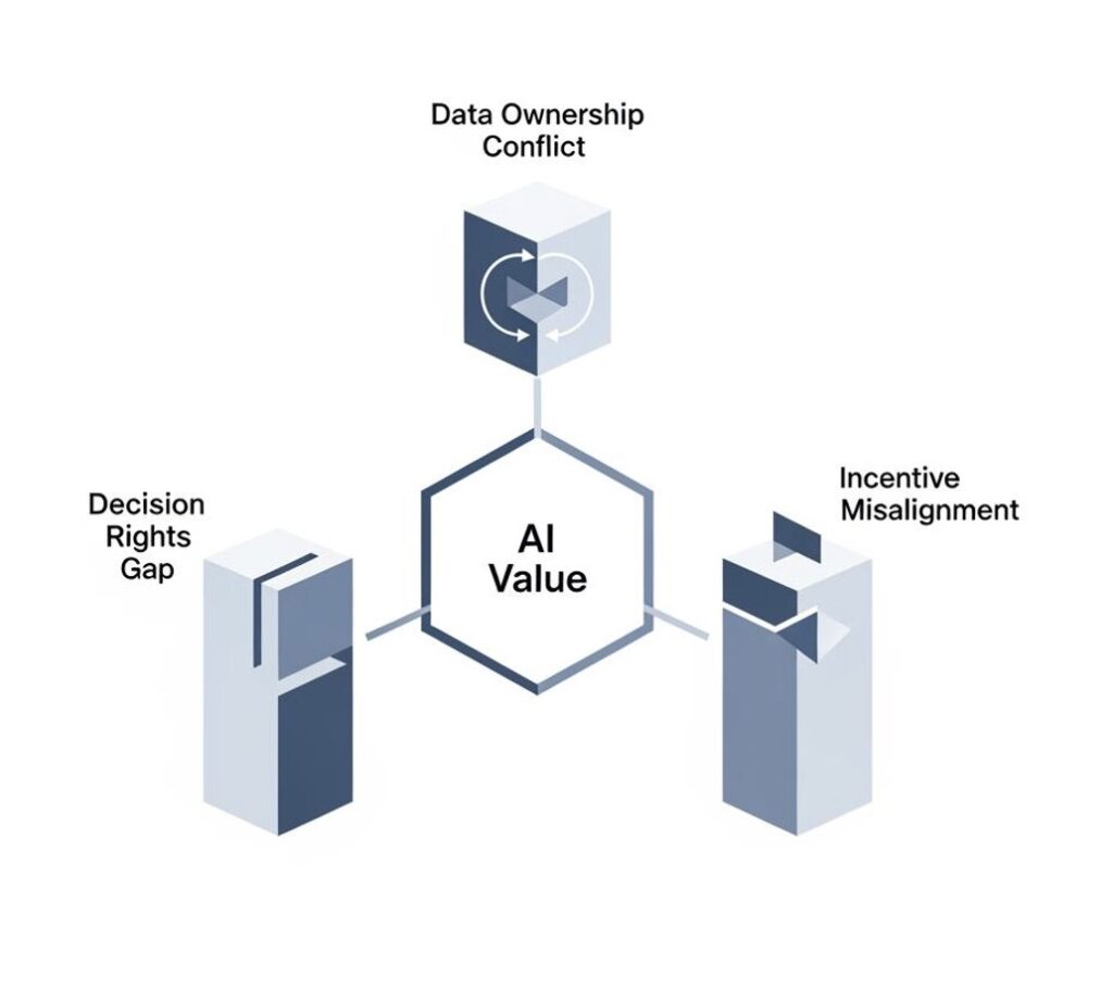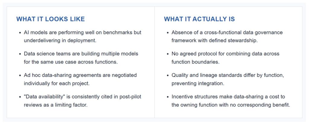 In practical terms, this makes the issue particularly difficult to resolve through the AI programme alone. It cannot be piloted away. It cannot usually be delegated to a digital team. It requires executive sponsorship, cross-functional authority, a willingness to change systems that sit well beyond the AI agenda itself — and the discipline to address it in the right sequence rather than the most visible one.
