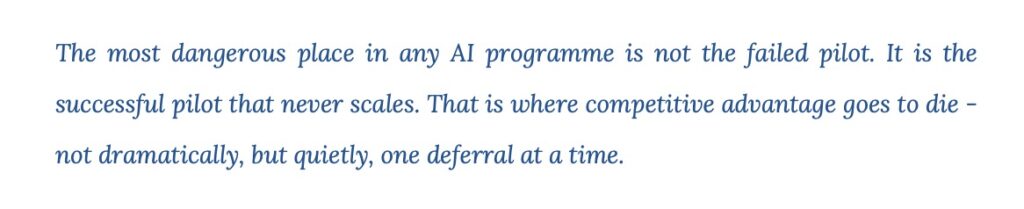 In these environments, no single function is obstructing progress. Each is acting within a legitimate remit. Yet the cumulative effect is highly predictable: promising pilots are not formally rejected; they are deferred. Over time, they accumulate in a pipeline that signals momentum while producing limited enterprise value.